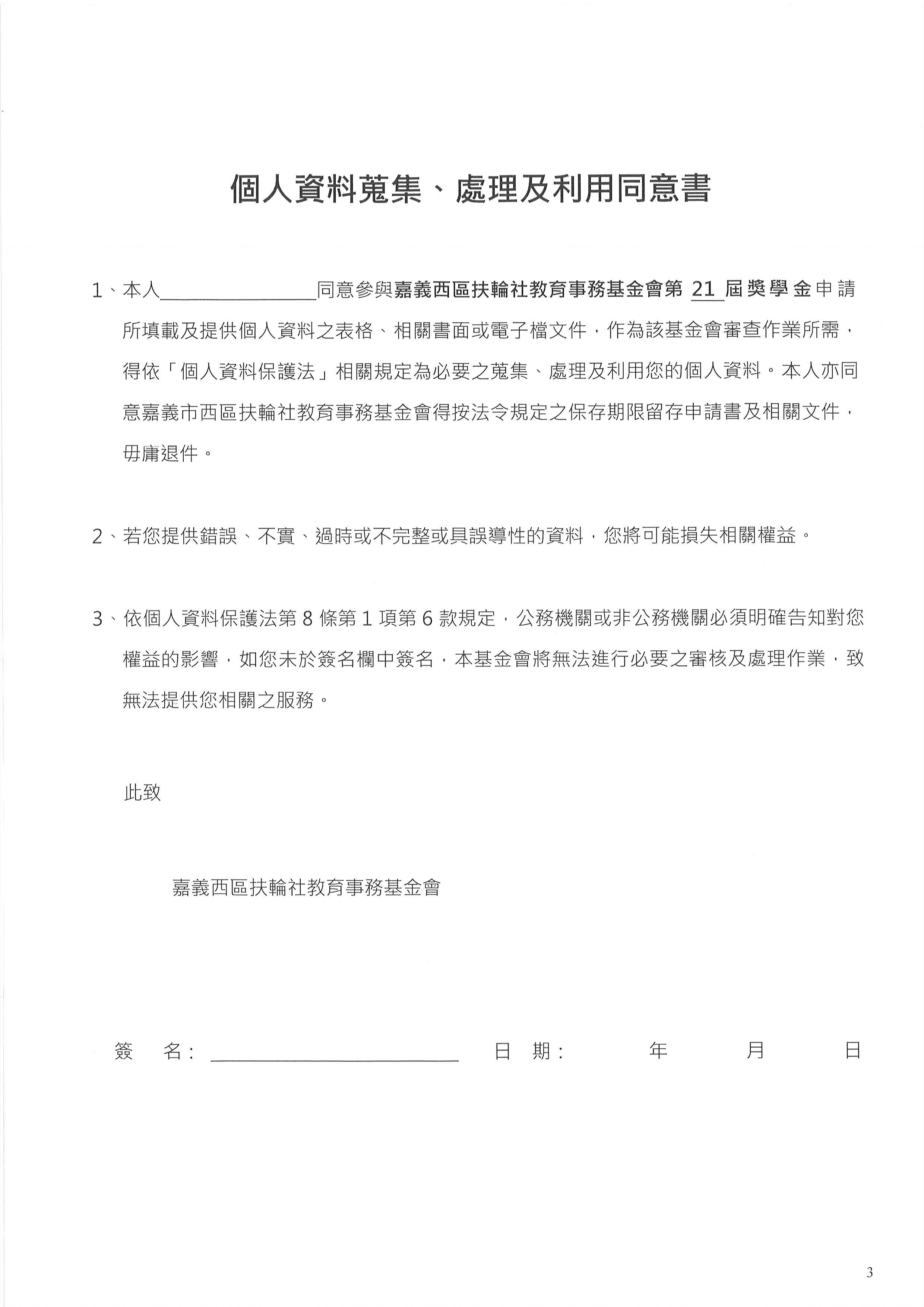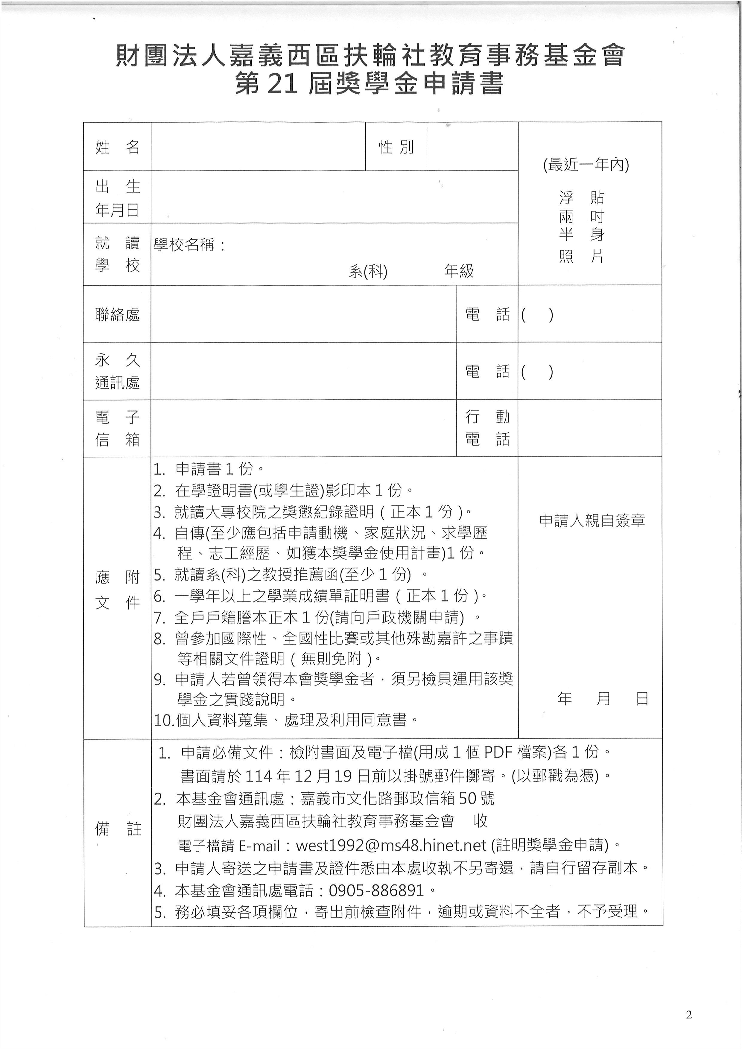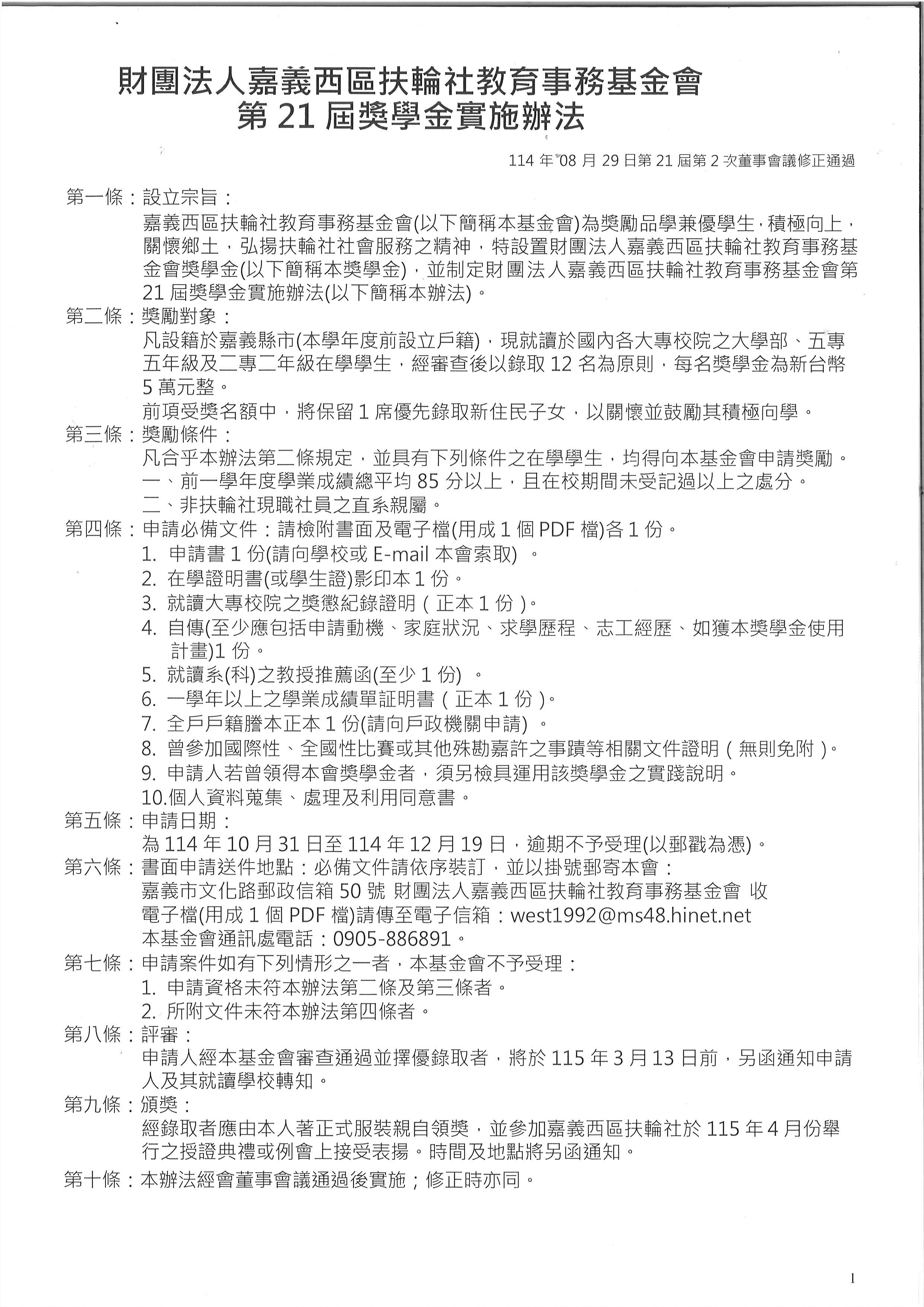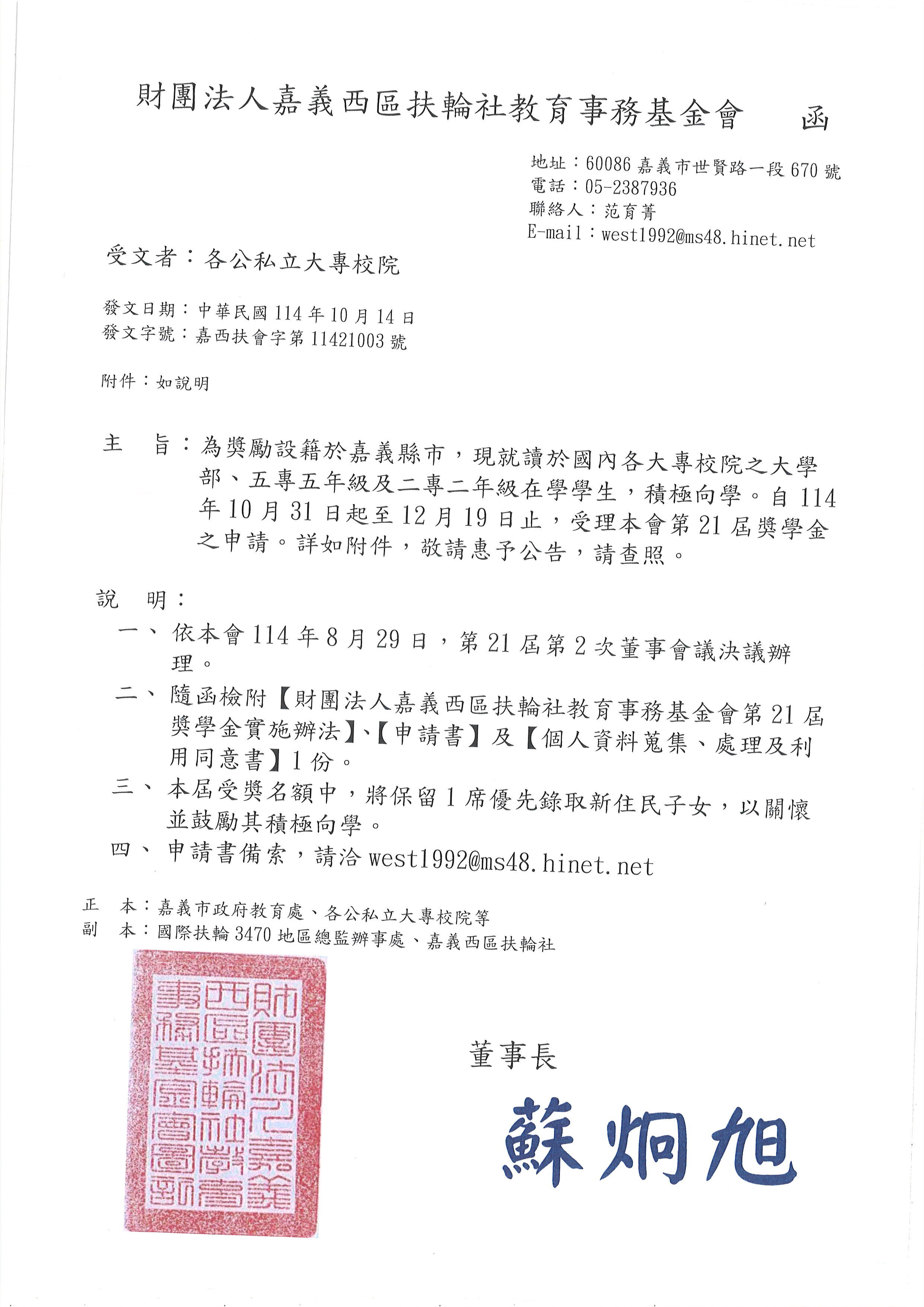 【訊息轉知】財團法人嘉義西區扶輪社教育事務基金會第21屆獎學金